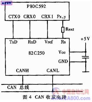 CAN总线收发器82C250是CAN控制器和物理总线间的接口,最初为汽车高速通信设计,具许多针对车辆应用设计的结构。其特点包括:有效减小汽车环境瞬间干扰对信号的影响,具有保护总线能力;防护电池与地之间发生短路;支持低电流待机方式等,因此十分适合电动车辅助逆变电源的需要。将82C250与P80C592的CAN接口输入、输出端相连,便构成了辅助逆变电源对外通讯的接口,如图4所示。