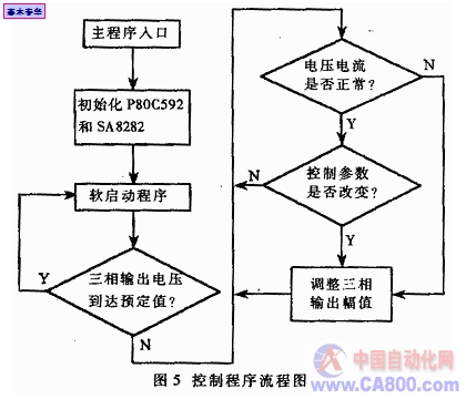 系统上电运行后,单片机P80C952首先对SA8282芯片初始化寄存器进行数据初始化,然后根据负载电机的特点执行软启动程序。当三相输出电压达到预定值时,三相逆变电源即进入稳定运行状态。此后控制程序将循环检测各线路的电压、电流情况,根据情况修改SA8282控制寄存器参数,调整PWM输出,从而改变三相输出。例如,电动车运行一段时间后,电池组电压下降,导致逆变电源的三相输出电压低于设定值,P80C592检测到该现象后,通过SA8282提高电压输出幅值,确保电源输出的稳定。