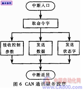 CAN总线通讯程序包含若干子程序,其基本程序结构如图6所示。当通讯程序触发后,P80C592的CAN控制器提据命令字执行相关任务。当上位机请求数据时,将逆变电源的各项运行参数传输给整车系统;当上位机查询节点状态时,将当前CAN节点状态等数据发磅出去;当上位机要求修改运行参数时,将接收的数据参数存入数据存储器。