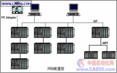 1)。设计中用到4种方式进行数据传输:MPI、DP、RS232、IM360/361;其中触摸屏是接受RS232接口,通过315集成的DP接口下挂PC adapter适配器,其间用85信号放大器以延长通讯距离。