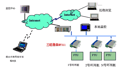 对于现有的环网柜、无功补偿装置、抄表装置等大量带有RS-232通讯口的设备,可以通过三旺通信串口服务器 NP311(1个RS-232/422/485串口设备联网服务器)将这些设备组成以太网(多为光纤以太网),在此系统中,仪器与Intranet/Internet是通过NP311连接起来的。这种Intranet/Internet的连接可以通过标准的以太网线,一个调制解调器/电话线,或无线modem(如CDPD)来实现。现在,通过这种连接,就可以使装有应用软件的远程系统通过标准网络访问现场设备。