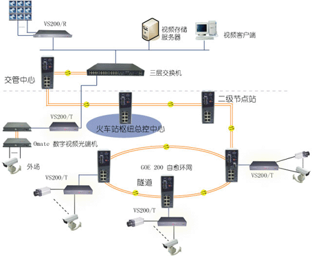 此系统用于火车站周边交通状况监视和控制,GOE200千兆工业级以太网机交换机搭建子系统骨干传输网络,隧道视频传输由VS200视频编码器编码,通过GOE200千兆环网将视频流上传,至火车站枢纽总控中心的网络视频服务器上,通过骨干网与交管局监控中心网络视频服务器客户端连接;外场视频通过视频光端机传至交管中心,再经VS200接入三层交换机,两中心都可以实时对站边环境进行监控管理。