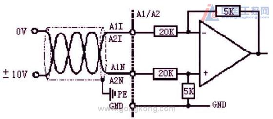 驱动模块中,设置2个10V的模拟量输入(A1,A2),通过电压/频率变换来确定输出脉冲的值,输出频率可控且范围取决于系统时钟脉冲。模拟值A1作为输入速度或扭矩的设置值,通过改变模拟电压A2的值去改变扭矩极限。微处理器每250μs执行一个循环。计数或脉冲的设定值通过中央控制模块输入,再由内部的信号线分配给每个驱动模块。电机转速的大小依赖于A1的输入电压值。由速度偏移量来补偿模拟输入值的浮动值,得到与模拟输入相应的恒定速度值。但持久地补偿至零速度是不可能的。