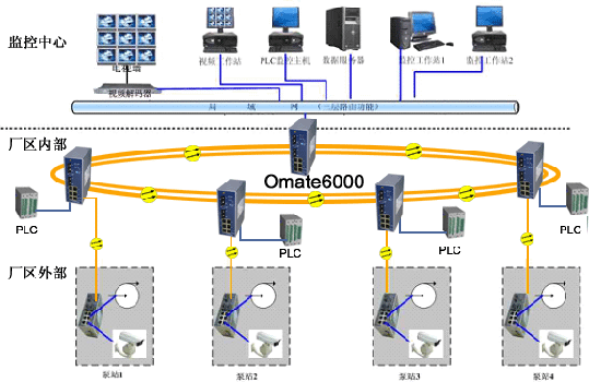 PLC的数据通过Omate6000构建的百兆交换网络传输到监控中心,使管理者可在由远程监控计算机及数据收集设备,了解现场水质标准、PH因子、水温等的实时信息。厂区外面的泵站有电机,摄像机等设备,通过接入交换网络,可以在中央控制房有效地监视和控制。