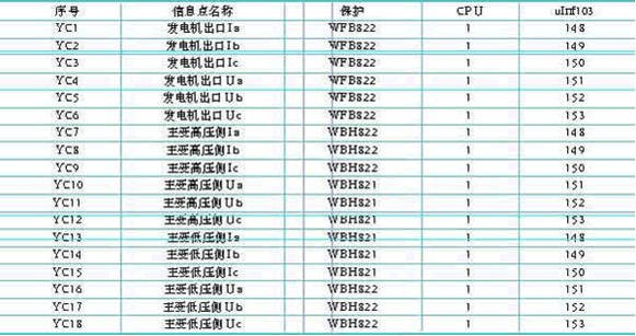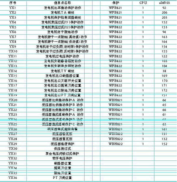本继电保护系统的主要监测对象包括:一台发电机组、一台主变压器、两回10kV出线、400V厂用变;保护对象包括电站的发电机、变压器、10kV出线。该继电保护系统提供一智能通讯服务器,其功能是将许继设备的通讯规约转换为MODBUS规约,预留RS-485通讯接口与CP340进行通讯。通讯的数据量包括遥信信息点(功能码02,起始查询地址0):YX1~YX36,祥见表1。遥测信息点(功能码03,起始查询地址0)YC1~YC18,祥见表2。