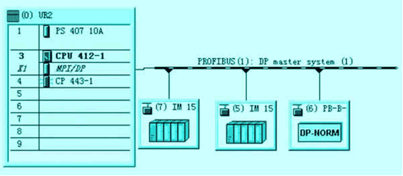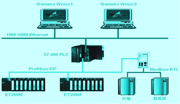 在本自动控制系统中,将西门子S7-400 PLC作PROFIBUS主站,ET 200M和PB-M网桥作PROFIBUS从站。另一方面,在Modbus总线中将PB-M网桥作Modbus主站,继电保护装置和直流屏设备作为Modbus的从站,双方以9600bps的通讯速率进行通讯。具体的网络结构如图1所示: