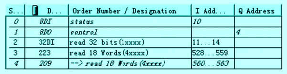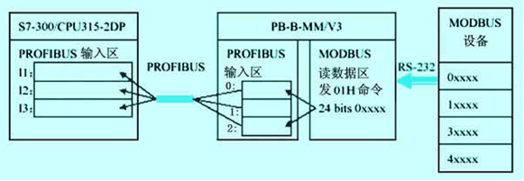其中,I1..I3是PROFIBUS主站分配给这个MODBUS模块的PROFIBUS输入地址I1~I3,对应本MODBUS报文读到的24 bits (0xxxx)。这样,PLC在进行编程时,直接读取I1~I3即可得到MODBUS 的24个输出线圈0xxxx的状态。