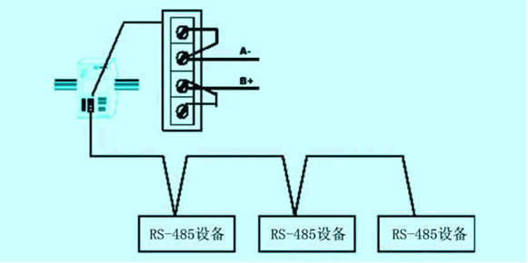 PB-M网桥还提供RS-232/485接口,其他MODBUS从站可以通过该接口实现与PB-M网桥的通讯。须注意的是在RS-485总线终端要加终端电阻,PB-M网桥已内置终端电阻,只需用外接短接线将其接入RS-485网络即可。图2是RS-485网络连接和终端电阻的连接示意图: