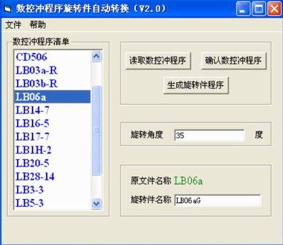 编A、B两个数控冲程序显然比较费时,在实际加工中要远比此复杂,有没有可能只编一个程序而通过某种方式得到另一个程序呢?笔者通过VB编写了一款数控冲程序旋转件自动生成的小软件,图3是小软件的工作界面。通过输入旋转角度后,可以自动生成将零件旋转任意角度后的数控冲程序,并且生成的程序可以直接拷入设备使用,极大地提高了工作效率。