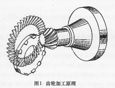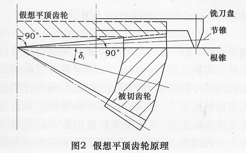 螺旋锥齿轮加工是通过机床上的摇台机构模拟一个假想齿轮,安装在摇台上的刀盘切削面是假想齿轮的一个轮齿。当被加工齿轮与假想齿轮以一定的传动比绕各自的轴旋转时,刀盘就会在轮坯上切出一个齿槽,如图1所示。在调整切齿机床的时候,必须使被切齿轮的节锥面与假想平顶齿轮的节锥面相切并做纯滚动,而刀顶旋转平面则需和被切齿轮的根锥相切,如图2所示。所以铣刀盘轴线与被切齿轮的节锥面倾斜一个大小等于被切齿轮齿根角y的角度。这样就产生了刀号修正的问题。从而导致被切齿轮的加工调整较为复杂,刀片的规格比较多。在加工渐缩齿圆弧齿锥齿轮时,都是采用这种切齿原理的。