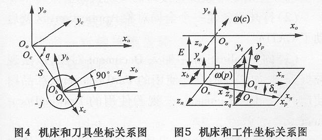 根据螺旋锥齿轮啮合加工原理,切齿产形轮和被加工齿轮可以看作一对啮合的齿轮副。可计算出螺旋锥齿轮的几何参数和切齿参数,从而得到机床调整参数。有了机床调整参数就可以建立起各坐标系之间的关系,以及刀具和工件在这些坐标系中的位置和姿态。图4给出了机床和刀具坐标关系图,图5给出了机床和工件坐标关系图。
