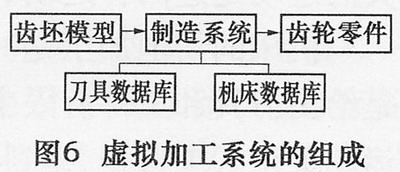 加工仿真系统主要由刀具数据库和机床库两部分组成,刀具数据库记录了刀具的形状和尺寸,机床数据库记录了加工时机床的调整参数。如图6,当齿坯模型进入制造系统后,通过在刀具数据库中选择相应刀具的类型和尺寸,调节齿坯在机床上的位置参数及刀具的加工行程等机床参数,便可生成对应参数虚拟加工出的齿轮零件模型。