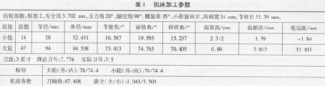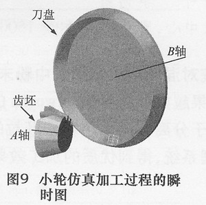 选择一对螺旋锥齿轮,其加工参数如表1。将参数输入仿真程序,运行程序后可在CATIA V5窗口中看到加工过程。图9为仿真加工过程的一幅瞬时图。加工完成后,对模型添加其它特征后可得最终模型图,如图10。图11是在YH603铣齿机上用与加工仿真软件相同的数据,实际加工出的一对相啮合的螺旋锥齿轮实物照片。从图上看,加工仿真图和实物图的齿形齿向是一致的。经实际检验,仿真结果与实际结果也是符合的。由此说明数控加工仿真系统可以非常精确地模拟出CNc铣齿机实际加工过程,仿真结果是准确、可靠的。