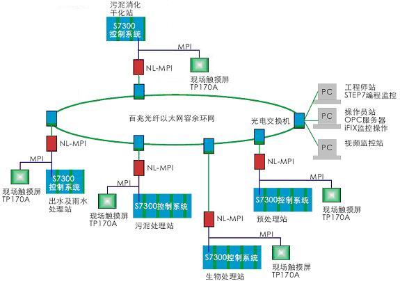在系统网络上我们采用以太网容余光纤环网以满足系统高速通讯的要求,控制系统设计采用五套西门子S7300控制系统用来负责五个站点的控制,现场通过西门子TP170A系列触摸屏实现就地操作,同时每套S7300控制系统通过NL-MPI和就地光电交换机接入环网。上位计算机操作员站运行iFIX监控软件,通过OPC-NL-MPI服务器来读写所有S7300控制系统的实时数据,工程师站可以通过STEP7对所有S7300站点CPU进行编程和监控。
