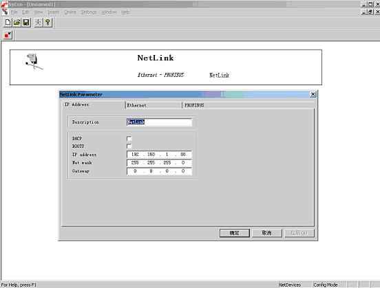 然后,打开SYCON软件,新建配置文件,插入一个netLINK设备,选择以太网TCP/IP方式搜索网络上的netLINK设备,如果是是新的netLINK需要设置一个临时的IP地址,作为网络识别;