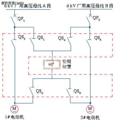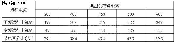 变频器有着“现代工业维生素”之称,在节能方面的效果不容忽视,现已广泛应用于国民经济的各行各业和人民的日常生活中,高压电动机加装变频器,实现设备电动机的无级调速正是目前应用最广的一项电动机调速节电技术,经验数据表明,变频节电效果至少在30%。以下介绍天津大唐国际盘山发电有些责任公司(以下简称盘山发电公司)对汽机凝结水泵进行变频改造实现节能降耗的具体例证。 一、设备概述 盘山发电公司2×600MW火电机组是我国华北地区建设投产最早的600MW亚临界火电机组,是京津唐电网的主力机组。 该公司每台机组配有2台立式长轴泵凝结水泵。1台凝结水泵即可满足机组BMCR工况要求,运行中采用一台运行一台备用的方式。 凝结水泵属于是立轴静叶出力不可调水泵。凝结水量的调整通过“除氧器水位调节站”中的30%流量调整门和70%流量调整门来调整,维持正常运行中的除氧器水位。 二、凝结水泵变频改造 由流体力学可知,泵与风机的流量与转速的一次方成正比,压力与转速的平方成正 比,功率与转速的立方成正比,如果水泵的效率一定,当要求调节流量下降时,转速可成比例地下降,而此时轴输出功率成立方关系下降,即水泵电动机的功率与转速近似成立方比的关系。变频器就是利用电力电子器件的通断作用将工频电源变换为另一频率的电能控制装置。先把工频交流电源通过整流器转换成直流电源,然后再把直流电源转换成频率、电压均可控制的交流电源供给电动机。频率可控即电动机转速可控,从而达到节能的目的。 盘山发电公司的2台600MW机组,每台机组配备了2台凝结水泵,单台额定容量为1940 m3/h,电动机功率为2500 kW, 额定电流274A, 正常为1台运行,另1台备用,在额定600MW负荷下运行最大电流250.5 A,只有额定电流的91.4%,低负荷运行最低电流到200 A左右,是额定电流的73%。根据对凝结水泵运行工况和参数的分析,盘山发电公司对凝结水泵进行了变频改造。由于凝结水泵正常运行方式是一运一备,故将采用“一拖二”方案,即每台机组的2台凝结水泵可共用1套变频装置,以节约投资。 三、改造方案 2007年9月,盘山发电公司利用4#机组小修的机会对凝结水泵进行了变频改造。采用的是北京利德华福电气技术有限公司的HARSVERT-A06/280(正弦波系列异步电动机普通控制型)高压变频器。该系列高压变频调速系统采用单元串联多电平技术,6 kV输入,6 kV高压输出,属高-高电压源型变频器。该变频装置主机柜由控制柜、功率柜、变压器柜以及旁路柜4个柜体组成,高压变频器接入电气系统的方式如图1所示。其中:QF1、QF2为高压开关,QS1、QS4为入口刀闸,QS2、QS5为出口刀闸,QS3、QS6为旁路刀闸。 整个改造方案包括三部分改造。第一是就地高压变频器的安装和接入。在就地搭建了专门的变频小间,其中安装的主要设备包括:高压变频器主柜体、双路控制电源切换箱、高压变频器UPS(交流不停电)电源柜、高压变频小间柜式空调机以及变频冷却系统。高压变频器的所有就地操作、运行参数和报警参数的检查设置都在变频小间内完成。第二是电气开关部分的改造。6 kV高压开关加装了高压变频器保护回路和“工频变频工作方式”切换把手,配合凝结水泵变频运行和工频变频两种工作方式的切换。另外,从380 V低压交流厂用母线段和220 V直流母线段完成了高压变频器控制电源和操作电源的供电改造。第三部分是热工逻辑和DCS操作画面的改造。在DCS画面上增加一幅凝泵变频画面。在不同工作方式下启动凝结水泵的方法也不同。当工频方式下,画面提示凝泵在工频方式,在原画面的操作按钮上按下启动,则合6 kV开关直接启动凝结泵电动机,运行中,通过除氧器水位调节站凝结水量调整门的开度来调节凝结水量维持除氧器水位;当在变频方式下,画面提示凝结泵在变频方式,在原画面的操作按钮上按下启动,则仅合入6 kV开关,然后在新增画面上的高压变频器启动按钮上按下启动,则启动高压变频器同时启动凝结泵电动机,运行中的除氧器水位调节站凝结水量调整门保持全开,通过调整电动机转速改变出力以调节凝结水量维持除氧器水位。 四、旁路柜介绍 该变频装置主机柜由控制柜、功率柜、变压器柜以及旁路柜4个柜体组成,前三者属于高压变频器核心柜体。而旁路柜(如图1中虚线框内所示部分)的布置主要决定于高压变频器所带负载的数目以及工频和变频工作方式的切换方法。凝结水泵一运一备的运行方式决定了变频改造采用了一拖二的公用变频器的改造方式,因此,其旁路柜功能就较为复杂。它是由6个高压隔离开关QS1~QS6组成,隔离开关分别选用GN19系列单投和双投户内高压隔离开关,相间距为210 mm;单投隔离开关的进线端的3个绝缘端子为高压带电显示装置的3个传感器,柜面外加输入、输出端子实现工频、变频指示。如果M1工作在变频状态,M2可以工作在工频状态;相反如果M2工作在变频状态,则M1可以工作在工频状态;如果检修高压变频器,2台负载都可以工频运行。 一拖二的公用方式决定了实现变频运行工频备用的特殊工作方式,以及各开关刀闸之间复杂的闭锁关系。各开关刀闸之间复杂的闭锁关系如下: 1) QS1和QS4,QS2和QS5之间实现电气闭锁和逻辑闭锁。确保只能有1台凝结水泵可以投入变频,无法将2台同时投入变频方式。 需要说明的是,在凝结泵变频运行方式的判断回路中,采取