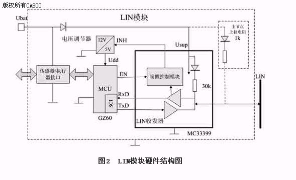 MC68HC908GZ60芯片(48引脚)具有1个ESCI通道、2个定时器通道、1个CAN通道和15个A/D转换通道。LIN通信仅占用了该芯片的ESCI接口用于与LIN收发器相连;一个定时器通道用于确定LIN通信中的定时;还有很多功能和通道可以用于扩展其他用途。选用LIN总线单线物理接口器件MC33399作为LIN收发器,LIN网络结构如图2所示。