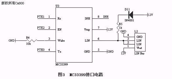 MC33399收发器支持的传输速率为1~20Kb/s,提供了正常和睡眠两种工作模式。INH引脚连接到电源管理芯片的INH引脚,可以控制电源电压调节器的工作模式,减小睡眠时的功耗。EN引脚由GZ60的PTE2引脚控制,当PTE2=1时,MC33399使能,进入工作模式;当PTE2=0时,MC33399禁能,进入睡眠状态,从而达到减小功耗的目的。Tx、Rx引脚分别与GZ60的PTE0、PTE1引脚相连,通过该ECU的ESCI模块来实现LIN总线的收发功能。由于不采用唤醒模式,Wake引脚通过电阻R4接地。其中,只有主节点的LIN引脚需要通过二极管和1kΩ电阻拉高,从节点所需的30kΩ上拉电阻已经集成在MC33399中,所以从节点无须外接上拉电阻,如图3所示。