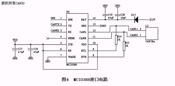 车灯控制系统中的主节点同时也是CAN/LIN网关,负责将LIN总线数据传输到CAN总线上,GZ60的一个CAN通道用来提供与CAN总线的接口。CAN总线收发器选用Freescale公司的MC33388。该收发器支持的最高CAN速率为125Kb/s,在睡眠模式下,功耗很小。CAN模块的硬件电路如图4所示。