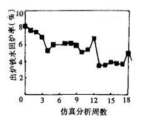 美国的Foundry Service公司(FSC)为了将其熔化设备的熔化能力从每炉1350kg增加到2000kg,计划增加一个大型浇包和相应浇包运输设备,目的是减少铁液输送系统对熔化能力的制约。该公司利用Witness仿真软件包建立了一个包括给料、预热、熔化、出铁液、铁液的运输、浇注以及造型的完整工艺过程的仿真模型。这个模型还通过和AutoCAD接口获取车间的布局信息,从而得到各种设备的位置和距离。这个模型的数据是建立在各种设备的生产报告、维修报告和生产计划等数据统计结果上的。但是,在得到的仿真分析结果中出现了与预期相反的结论。仿真分析表明,炉料的增加与快速的出铁液周期相抵触,在三次快速出铁液之后,熔化炉就只能起到铁液容器的作用,直到下一次或两次出铁液后才能继续向熔化炉中填料,这就会导致在生产周期中有一段时间生产线得不到铁液供应。仿真分析表明,适当的减少炉料加入量并调整每次加炉料后取铁液的量和次数,会加快铁液供应的周期,减少熔化工段对生产效率的制约。仿真分析铁液出炉率结果如图3所示。由图3可以看出,仿真分析过程中不断调整铁液的回炉量,当回炉量下降到改造前的58.4%时,可以使造型线的生产率提高22.1%。按照仿真结果更改设备参数后的生产实验支持了仿真结果。FSC公司成功地利用虚拟制造技术完成了生产系统的投资改造,并避免了不必要的熔化设备的投资。
