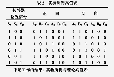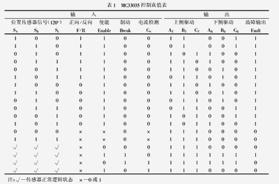 在电机实际操作之前,以手动方式转动电机,用万用表测量电机上设置的霍尔传感器的三路输出信号与 MC33035 输出信号真值表是否一致。实验结果,如表 2 示。