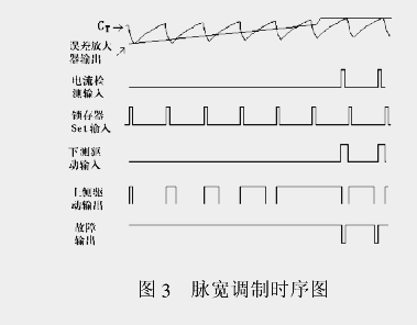 除非由于过电流或故障状态使 6 个驱动输出调闭锁,在正常情况下,误差放大器输出与振荡器输出锯齿波信号比较后,产生脉宽调制( PWM )信号,控制 3 个下侧驱动输出。改变输出脉冲宽度,相当于改变供给电动机绕组的平均电压,从而控制其转速和转矩。脉宽调制时序图,如图 3 示。