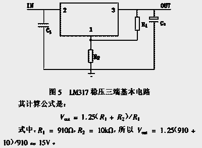 首先要作调整的是电源。试验中选用的电机是三相六极电机,n0 = 1500r/min, I0 = 10A, U0 = 50V 。在供电电源和 MC33035 的 脚 17 之 间 加 入 LM317 稳 压 三 端 以 保证MC33035的Vcc在许可的范围内。LM317 是 50V 输入、 15V 输出的稳压三端。它的基本电路结构,如图 5 示。