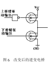 另外,因无法做成图 1 所示的 NPN-PNP 逆变桥。故用了 N 沟道的 VMOS 管,可组成六路逆变桥的电路,由于上侧驱动信号只能直接驱动 p 沟道的 VMOS 管而下侧可直接驱动 N 沟道的 VMOS 管。因而上桥臂与逆变桥之间的电路中加入反相器将驱动信号变非即可。组成后的电路图,如图 6 示。