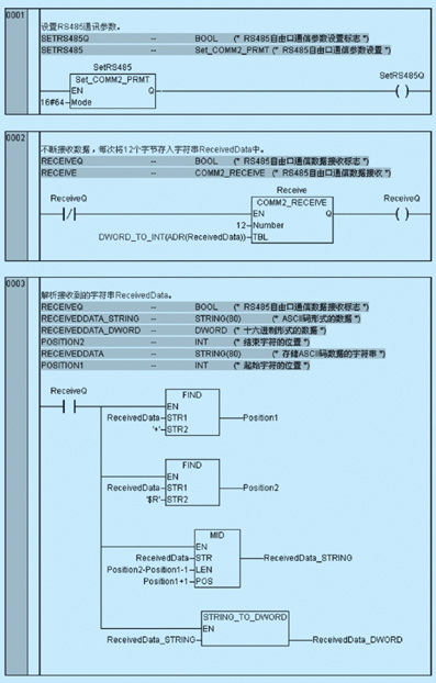 4.1 数据解析程序的变量定义 PROGRAM PLC_PRG VAR SetRS-485: Set_COMM2_PRMT; (* RS-485自由口通信参数设置 *) SetRS-485Q: BOOL; (* RS-485自由口通信参数设置标志 *) Receive: COMM2_RECEIVE; (* RS-485自由口通信数据接收 *) ReceiveQ: BOOL; (* RS-485自由口通信数据接收标志 *) ReceivedData: STRING; (* 存储ASCII码数据的字符串 *) Position1: INT; (* 起始字符的位置 *) Position2: INT; (* 结束字符的位置 *) ReceivedData_STRING: STRING; (* ASCII码形式的数据 *) ReceivedData_DWORD: DWORD; (* 十六进制形式的数据 *) END_VAR 4.2 数据解析程序的梯形图 如图2所示。