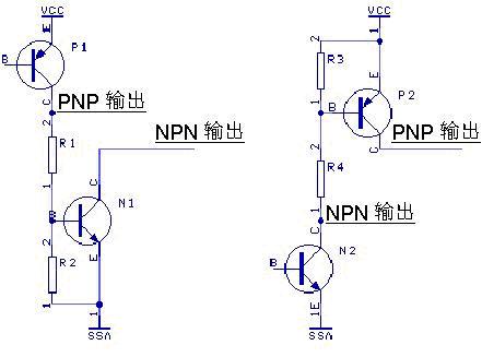 左图为 PNP 输出转换为 NPN 输出,右图为 NPN 输出转换为 PNP 输出,均为集电极开路形式。其工作原理不在此详述。