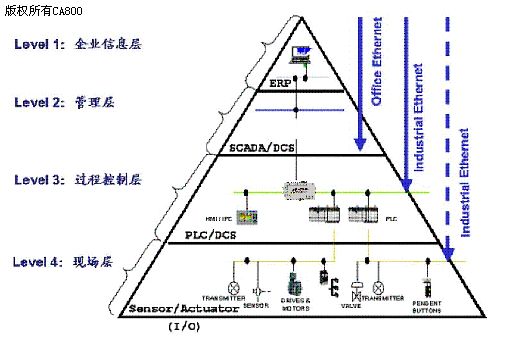 从上述企业网络层次可以看出,通过现场层和过程控制层的工业以太网,可以与管理层和企业信息层的办公以太网无缝连接,从而大大简化了整个网络构建,真正实现了企业的信息共享!当然出于网络及信息安全的考虑,可以通过VLAN划分,地址绑定,用户访问安全控制,数据加密,甚至增加防火墙等方法来保障。