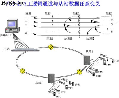 系统提供八个完全独立的总线式逻辑通道,可分别传输不同业务。每个站点最多提供8路总线式异步数据接口(RS232/485/422,自适应速率高达115.2Kbps),并支持从站数据与系统逻辑通道的任意交叉配置,极大方便了现场应用,如上图。