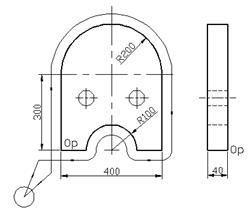 零件厚度为40mm,根据加工要求,每次切削深度为20mm,分2次切削加工,在这两次切深过程中,刀具在XY平面上的运动轨迹完全一致,故把其切削过程编写成子程序,通过主程序两次调用该子程序完成零件的切削加工,中间两孔为已加工的工艺孔,设图示零件上表面的左下角为工件坐标系的原点。