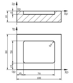 例题4 用直径为5mm的立铣刀,加工如图5所示零件,其中方槽的深度为5mm,圆槽的深度为4mm,外轮廓厚度为10mm。