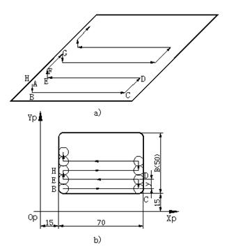 1 确定工艺路线 如图3所示,采用行切法,刀心轨迹B→C→D→E→F作为一个循环单元,反复循环多次,设图示零件上表面的左下角为工件坐标系的原点。