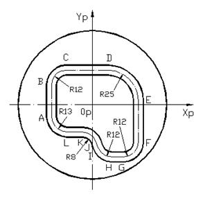 将刀心运动轨迹A→B→C→D→E→F→G→H→I→J→K→L→A编写成子程序,设每次切削深度4mm,主程序两次调用该子程序完成槽的切削加工,槽的切削深度用相对坐标表示其增量,设零件上表面的对称中心为工件坐标系的原点。