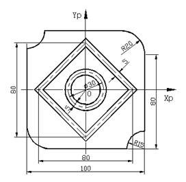 该零件的工艺过程由三个独立的工序组成,为了便于程序的检查、修改和工序的优化,把各工序的加工轨迹编写成子程序,主程序按工艺过程分别调用各子程序,设零件上表面的对称中心为工件坐标系的原点。