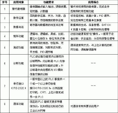 1 机型的选择 PLC机型选择的基本原则是,在功能满足要求的前提下,选择最可靠、维护使用最方便以及性能价格比的最优化机型。 在工艺过程比较固定、环境条件较好(维修量较小)的场合,建议选用整体式结构的PLC;其它情况则最好选用模块式结构的PLC。 对于开关量控制以及以开关量控制为主、带少量模拟量控制的工程项目中,一般其控制速度无须考虑,因此,选用带A/D转换、D/A转换、加减运算、数据传送功能的低档机就能满足要求。 而在控制比较复杂,控制功能要求比较高的工程项目中(如要实现PID运算、闭环控制、通信联网等),可视控制规模及复杂程度来选用中档或高档机。其中高档机主要用于大规模过程控制、全PLC的分布式控制系统以及整个工厂的自动化等。根据不同的应用对象,表1列出了PLC的几种功能选择。
