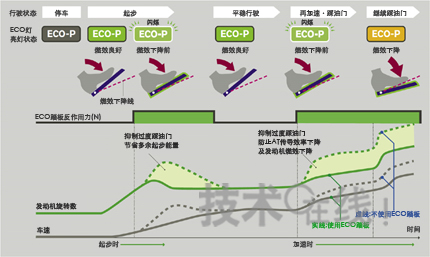 “ECO踏板”通过提高油门踏板的反作用力(使油门踏板变得稍微沉重),将超过一定力度踩下油门造成燃料消耗过剩这一信息传达给驾驶员。而提高油门踏板反作用力的要点是根据发动机燃效和自动变速箱的传导效率来计算。与此相配合,再通过指示灯的颜色变化和闪烁来提前将燃耗状况传达给驾驶员,由此,利用足部的感觉和视觉两个方面对高燃效驾驶提供辅助支持。如果驾驶员不过度用力踩油门,或者保持ECO灯不从绿色变成黄色,便可实现高燃效驾驶。采用该系统有望使大多数驾驶情况下的燃效提高5%~10%左右(日产的测量值)。