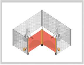 现在,机器人已经被广泛的应用于汽车制造领域。机械手运动的区域为危险区域。我们经常使用安全光栅/光幕、安全扫描仪、安全地毯和防护栅栏,以避免保护工作人员收到受机械手的伤害。如下图,2套安全光栅、2个安全扫描仪和大量的防护栅栏被用于2个机械手的危险隔离。在这里,3种不同的安全防护技术被应用于这个解决方案。而Pilz最新推出的产品SafetyEYE可以使用一种技术就可以完成以上所有的安全功能,并使成本更加低、使用更加灵活。