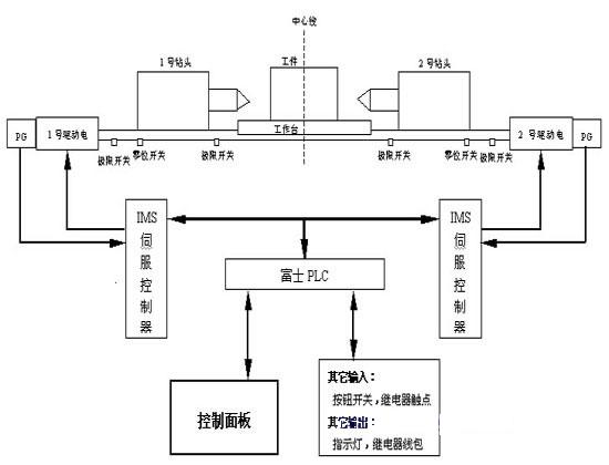 每台进给轴驱动电机由IMS伺服控制器进行位置控制,IMS伺服控制器通过相应编码器(PG)反馈信号构成位置闭环系统。所有的限位开关、零位开关等电气信号直接联入相应的控制器做为控制信号。2台伺服控制器利用内部集成的PLC功能,通过I/O信号与控制面板相连(根据不同用户的要求,也可使用RS422/485通讯的方式进行相应的连线)。由于本套设备相关参数不希望能够由设备操作者设定,因此控制面板上并没有参数设定功能,取而代之的采用了可即时插拔式手操作器的方式对相关参数进行修改(由相关技术人员进行修改)。