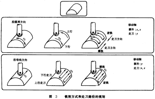 此外,切削策略如:走刀路径的规划,刀具轴线曲面法矢(曲面在该点的法向方向)或沿曲面切矢(曲面在该点的切线方向)的不同方式等,也是加工复杂型面的一个关键性因素。它不仅影响被加工工件的表面粗糙度,也影响到工件的形状和尺寸精度。图3是加工一个柱形曲面时采用的不同切削策略。在圆周方向进行切削,刀具轨迹要进行两轴联动插补。在用沿母线方向进行切削时,刀具只需作单轴的插补。另外,不同的切削方法,刀具的磨损差别很大,顺铣时的刀具磨损明显低于逆铣,往复铣削时的磨损远远大于单向铣削。