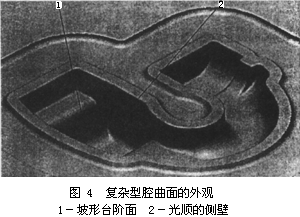 加工图4所示的工件时,假如采用图5a所示的行切轨迹分区加工;刀具的运动很不合理,切削条件很不理想,加工时间需要33min,工件表面粗糙度为6~9μm。倘若改用图5b所示的圈切轨迹分区进行加工,加工时间约需27min,工件的粗糙度也可降至2~4μm。