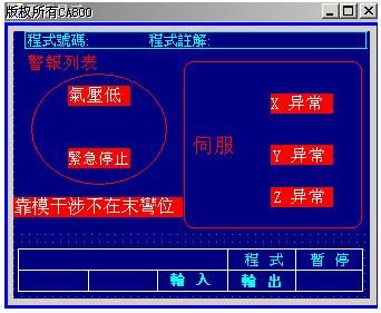 单节动作的执行MDI的模式下的运行,可以做单个弯曲动作。也可以对机台动作进行前期调试;手动各辅助动作测试以及轴向点动测试;完善的报警系统,在操作不当或机械故障时能在屏幕上作出提示,并停机报警,如图7所示。