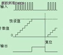 计数器的工作时序图如图二,当产品数量计数到达预设值时,计数器数字量输出信号动作,中止主机运行。等用户将计数器复位以后,主机又可以再次运行。