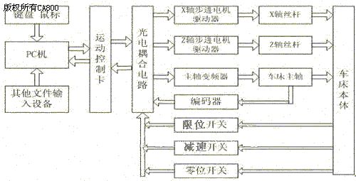 2、运动控制卡。我们采用了由ADVANTECH公司生产的PCL运动控制卡。该卡是一种高速三轴步进电机运动控制卡,它有16位的数字输入、输出口,可实现三轴联动。因此,它可以满足车床X,Z轴联动,实现直线,圆弧插补。
