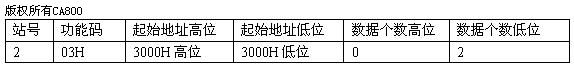 帧格式为:站号 功能码(03H) 起始地址高位 起始地址低位 数据个数高位 数据个数低位 CRC低位 CRC高位