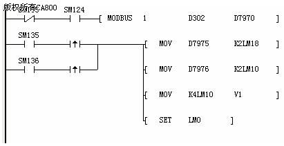 通讯组帧功能部分,通过字数据传输指令(MOV)可以将数据组成通讯帧,从D302开始到D307结束。艾默生的MODBUS协议自动在通讯帧的后面加了CRC校验,不需要使用者计算CRC校验。