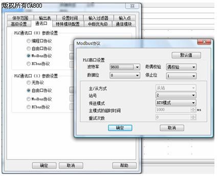 B)、触摸屏作为主站PLC作为从站,采用MODBUS主从式协议进行通讯,PLC从站地址选择为2,触摸屏主站地址设置为1.