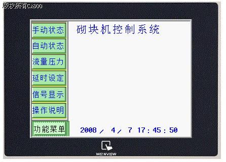可以在触摸屏上对砌块成型机的手动、自动状态、流量压力、延时进行设置,也可以显示当前的信号状态。